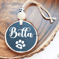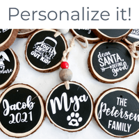 While one side of this ornament makes you smile with the holiday phrase of your choice, from funny gnomes to the family classic, A Christmas Story. The other side can be personalized with a pet's name, person's name, or family name. A pet's name will also have a paw print like the one pictured.