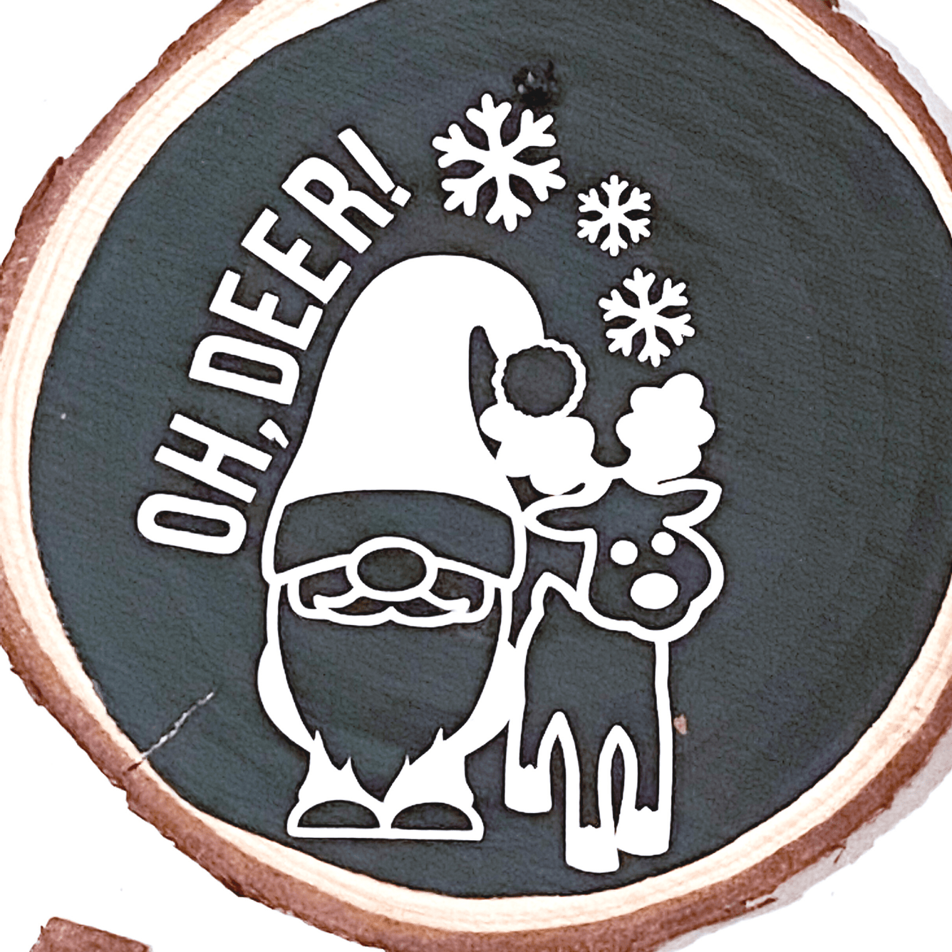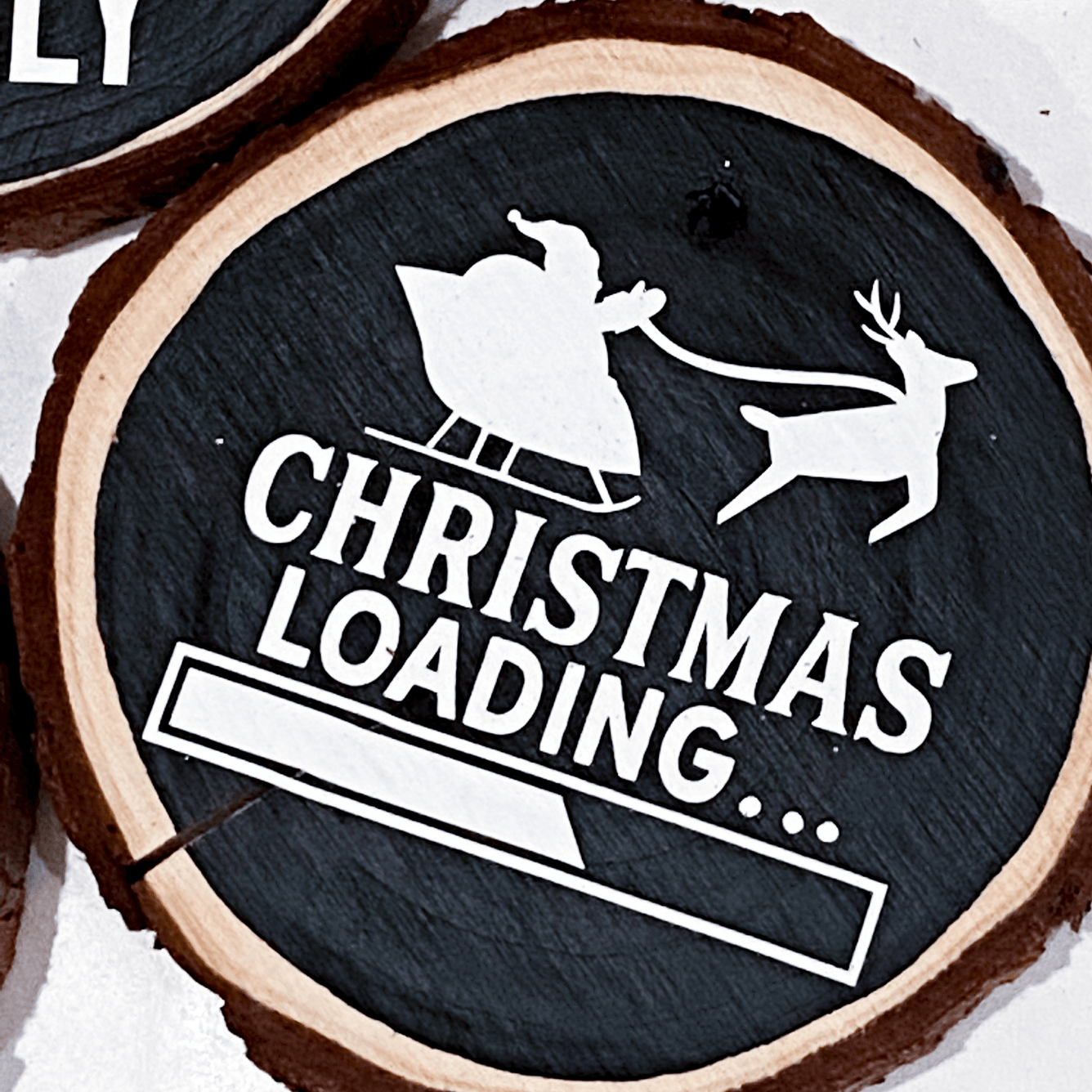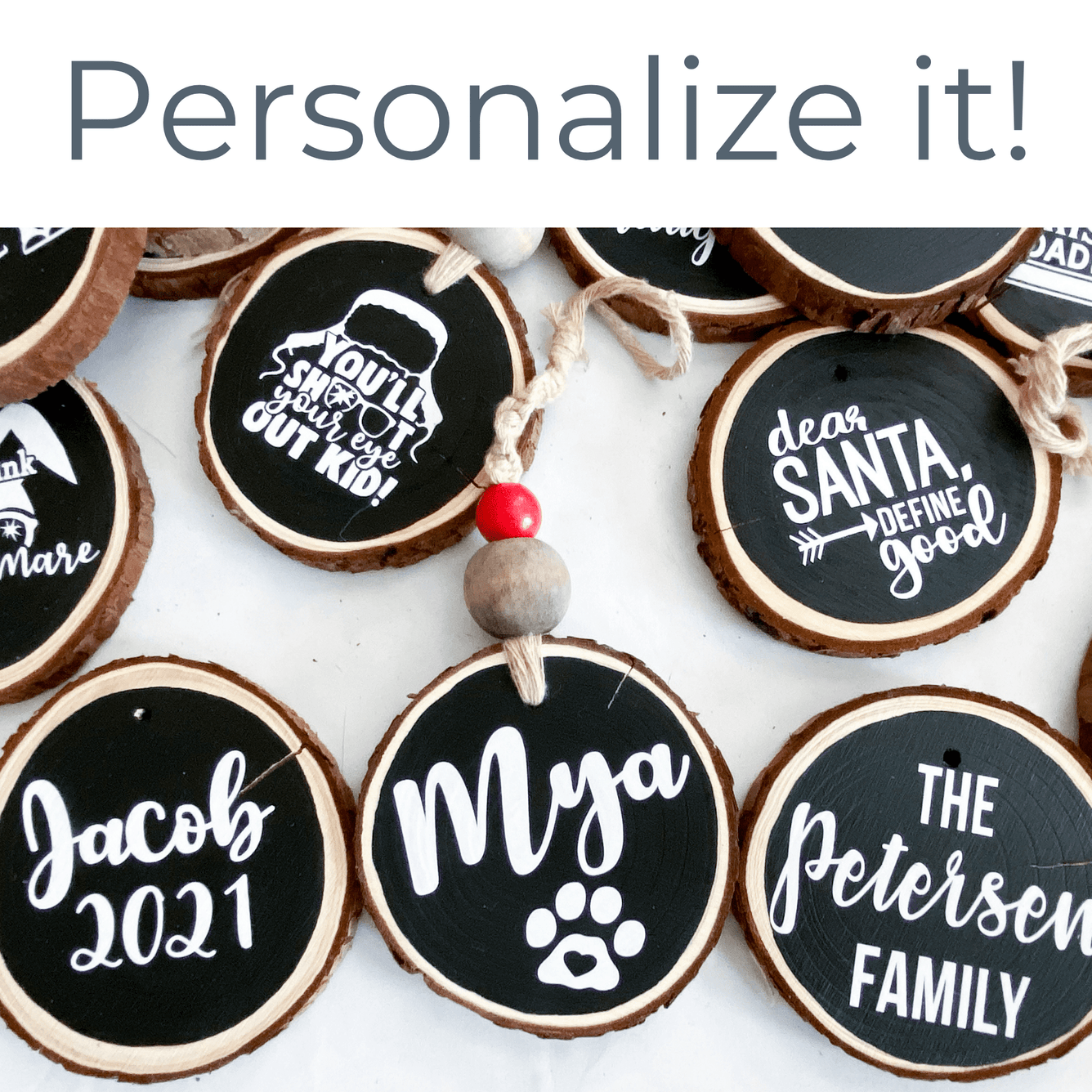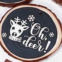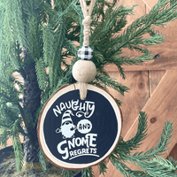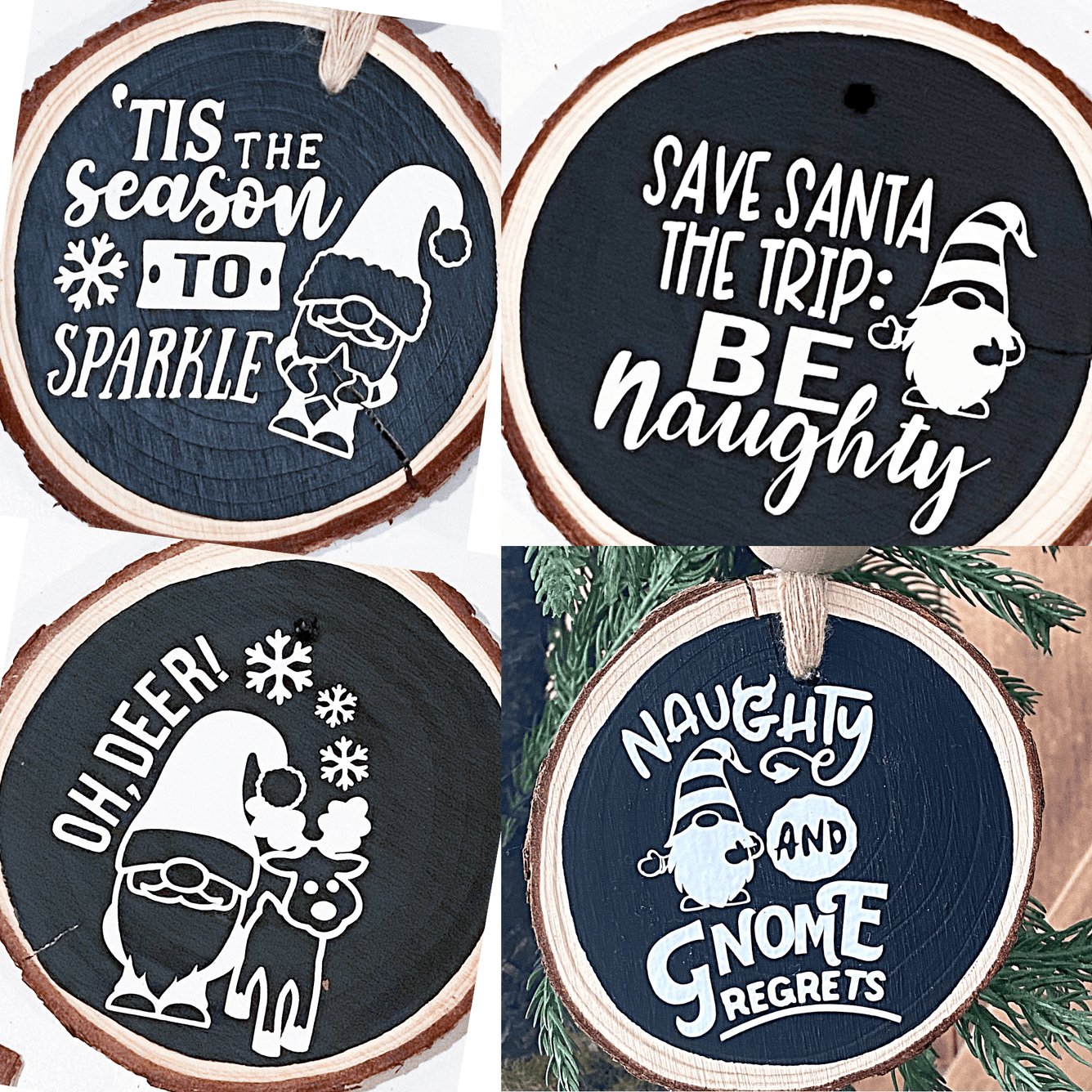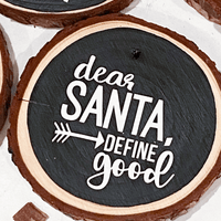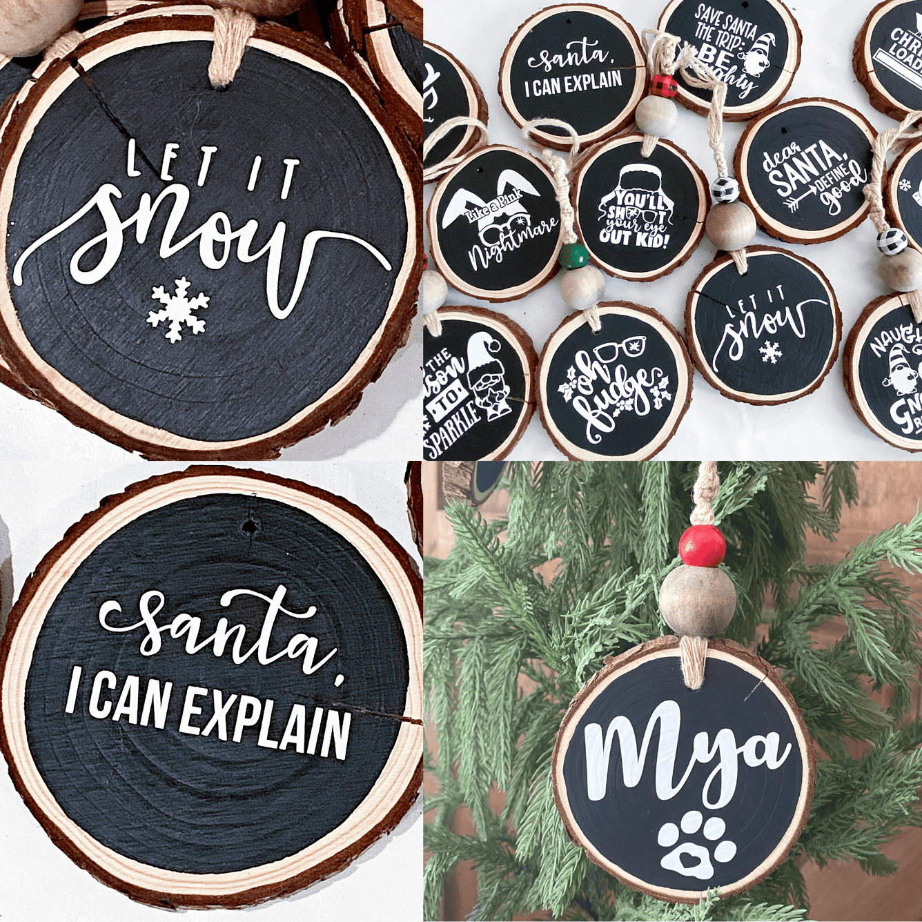 Spice up your holiday decorations this year with these wood tree ornaments! These ornaments are hand painted black, then adorned with permanent white vinyl to show off the cutest, most classic holiday phrases.