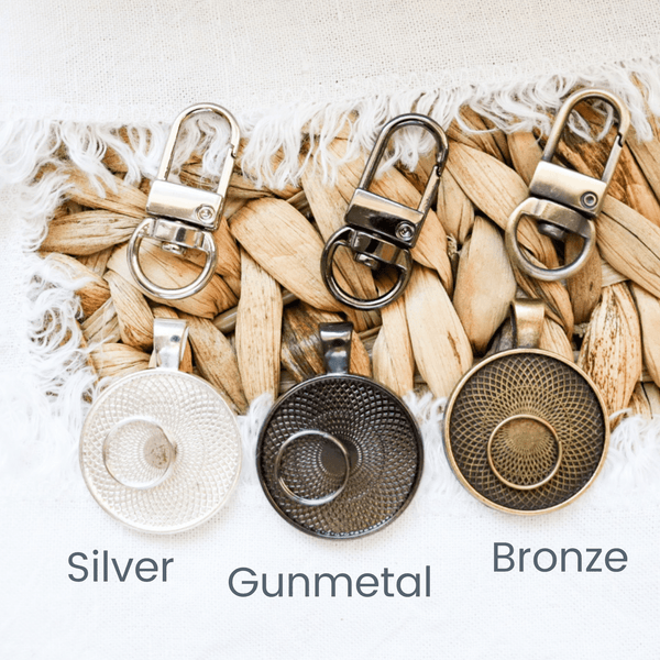 All tags are made with an alloy metal double sided frame. The design is created and secured within resin. The alloy is plated with silver, gunmetal or antique brass.